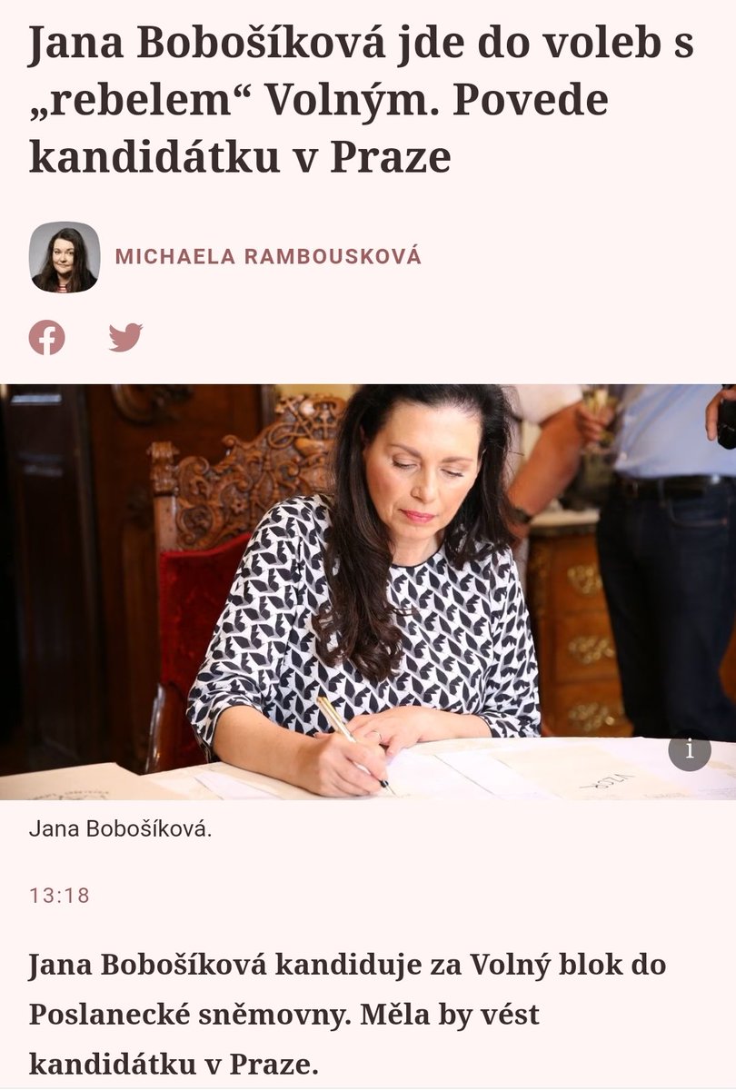 Sama hana lipovská v čerstvém rozhovoru pro reflex řekla, že spolupráci s janou bobošíkovou ukončovat nehodlá ani po oznámení její kandidatury za volný blok v praze.